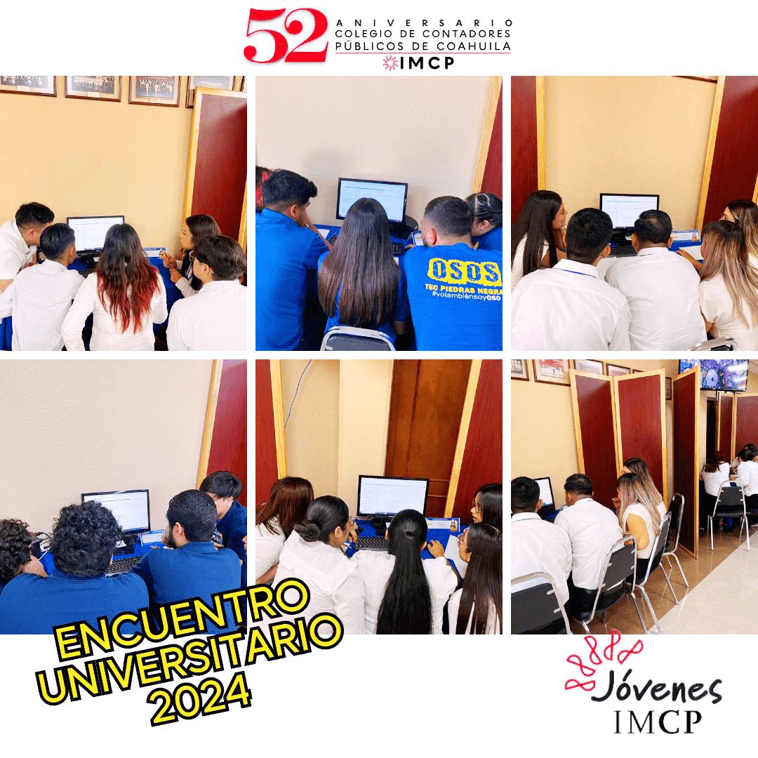El Encuentro Universitario “Jóvenes IMCP 2024” es un evento organizado por el Colegio de Contadores Públicos de Coahuila que se lleva a cabo el 6, 7 y 9 de mayo de 2024 a lo largo de las 3 delegaciones del Colegio (Monclova, Sabinas y Piedras Negras), donde se realizarán panel de estudiantes con la participación de diversas universidades, culminando con un examen para el Concurso.