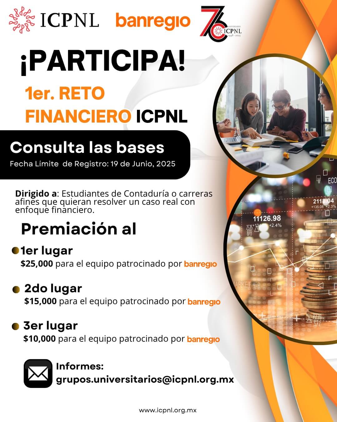Por tanto, se convoca a los estudiantes de la carrera de Contador Público y carreras afines a inscribirse en el 1° Reto Financiero del ICPNL. El objetivo de este concurso es estimular la capacidad de los estudiantes en la solución de problemas prácticos como los que enfrentan en la práctica profesional e incentivar las competencias de investigación y análisis de las temáticas que engloban a la carrera del Contador Público en la actualidad.