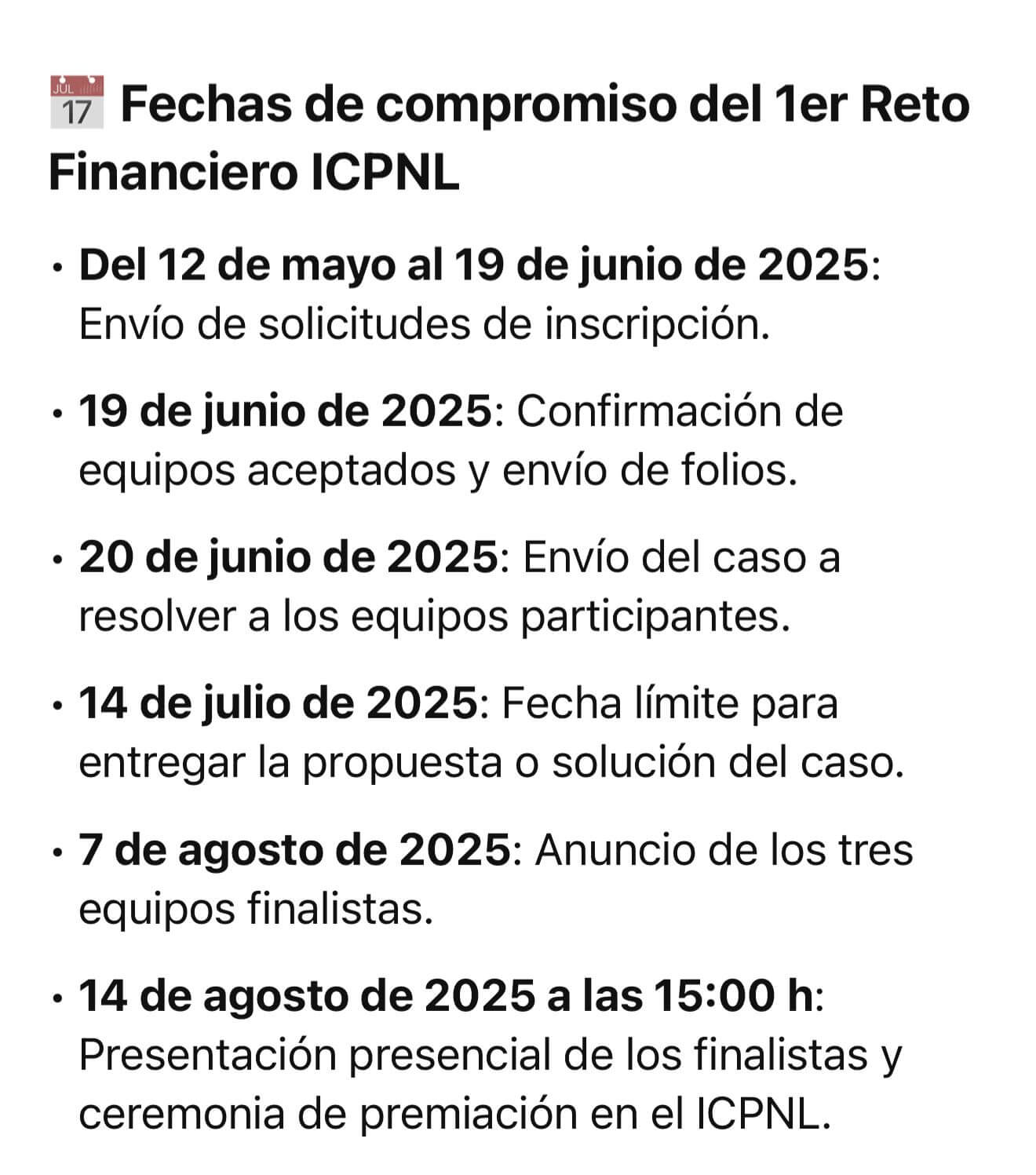 A continuación, encuentra el calendario de fechas importantes para participar en el 1° Reto Financiero del IMCP: