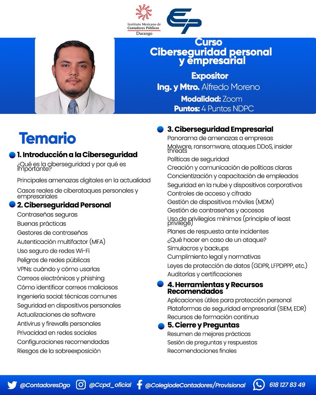 El curso Ciberseguridad personal y empresarial es un espacio del Colegio de Contadores Públicos de Durango A.C. donde Ing. y Mtro. Alfredo Moreno te guiará y ayudará este 9 de agosto de 10:00 a 14:00 hrs. a reforzar tus defensas digitales a través de ejemplos reales y herramientas prácticas.