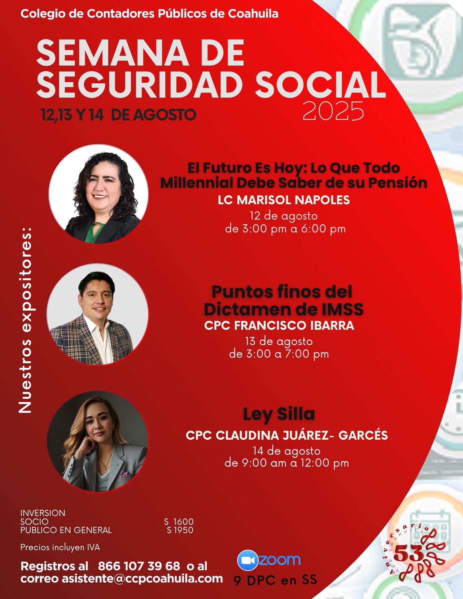 Del 12 al 14 de agosto, la Semana de Seguridad Social 2025 del Colegio de Contadores Públicos de Coahuila contará con la participación de destacados expositores, quienes ahondarán en: