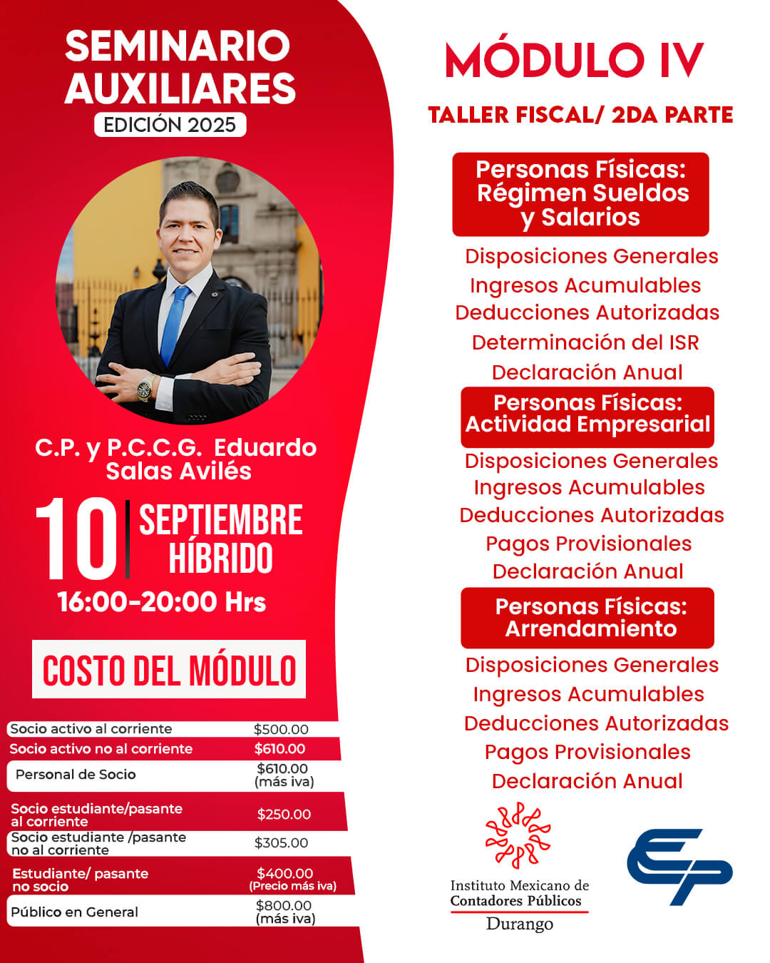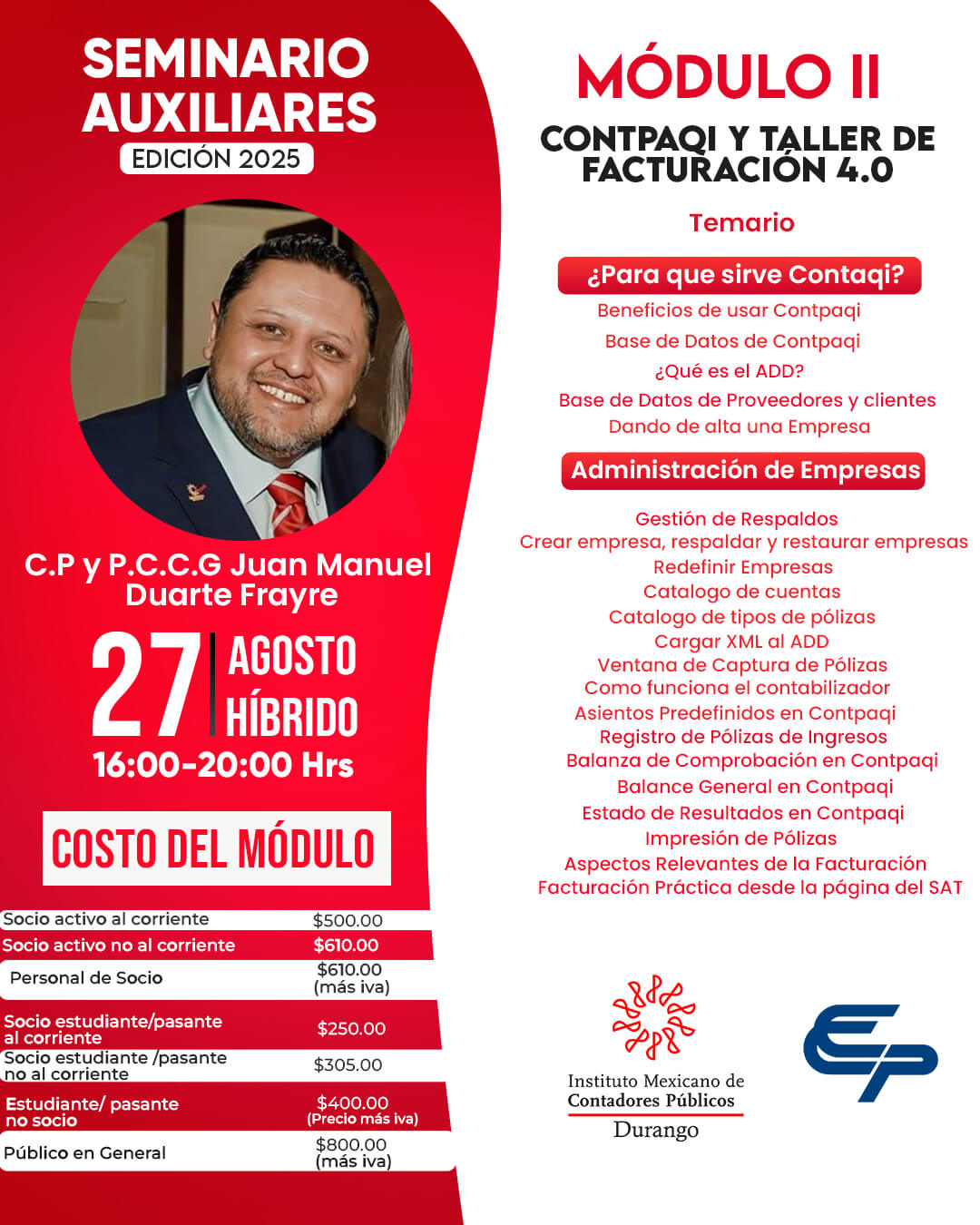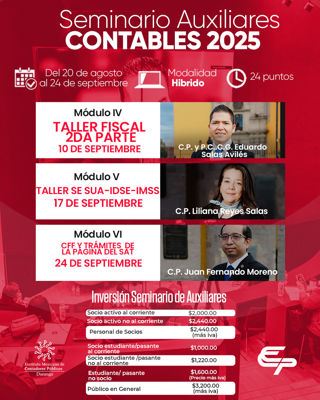 Así que lleva al siguiente nivel tus capacidades profesionales con 6 interesantes módulos del Seminario de Auxiliares Contables 2025, el cual se llevará a cabo el 20 de agosto al 24 de septiembre por el Colegio de Contadores Públicos de Durango A.C.