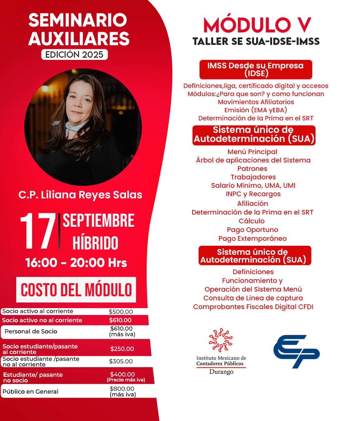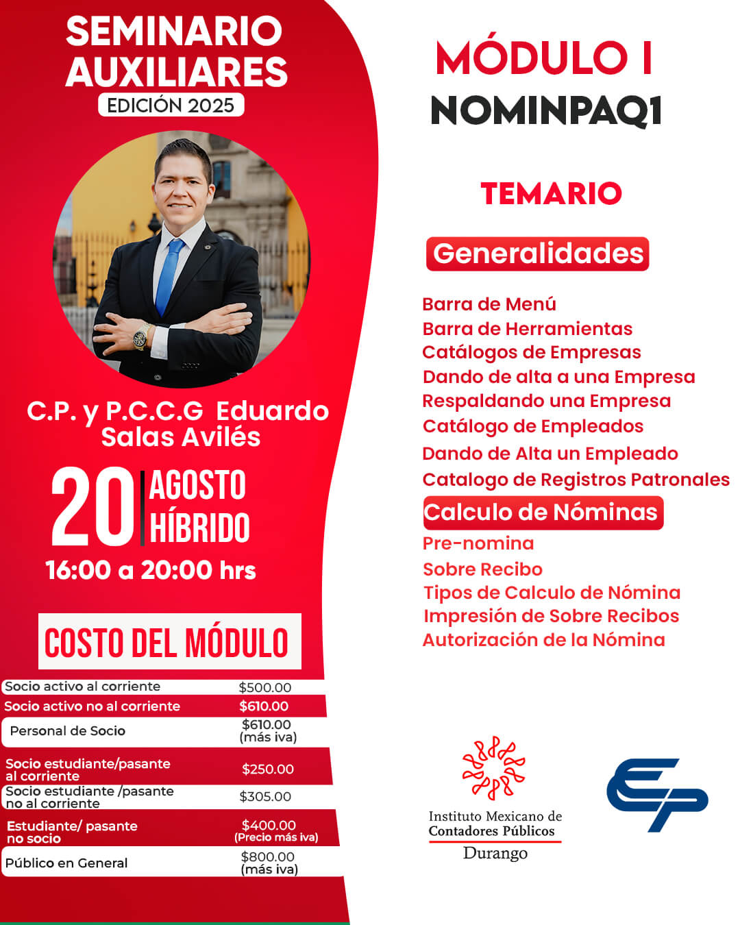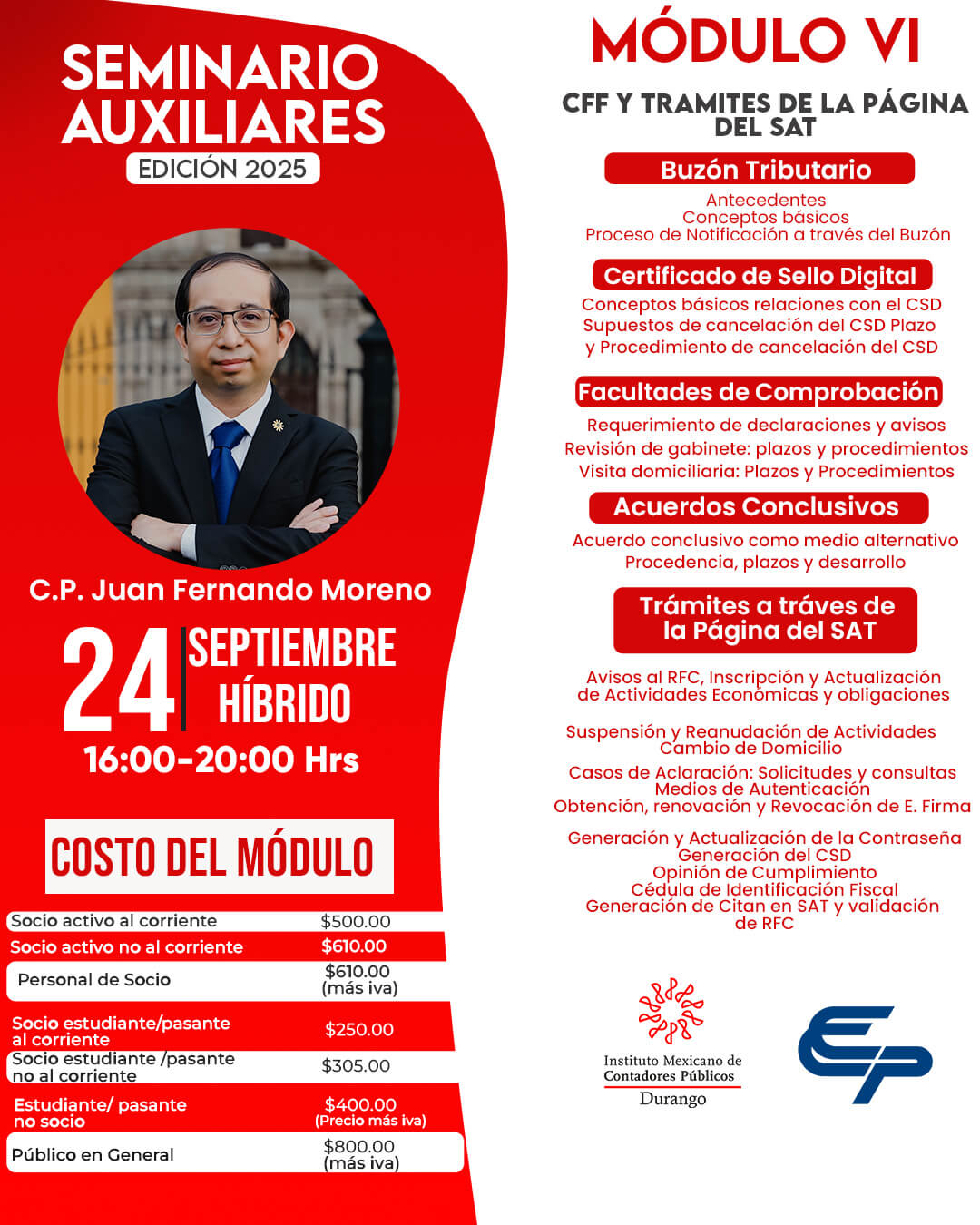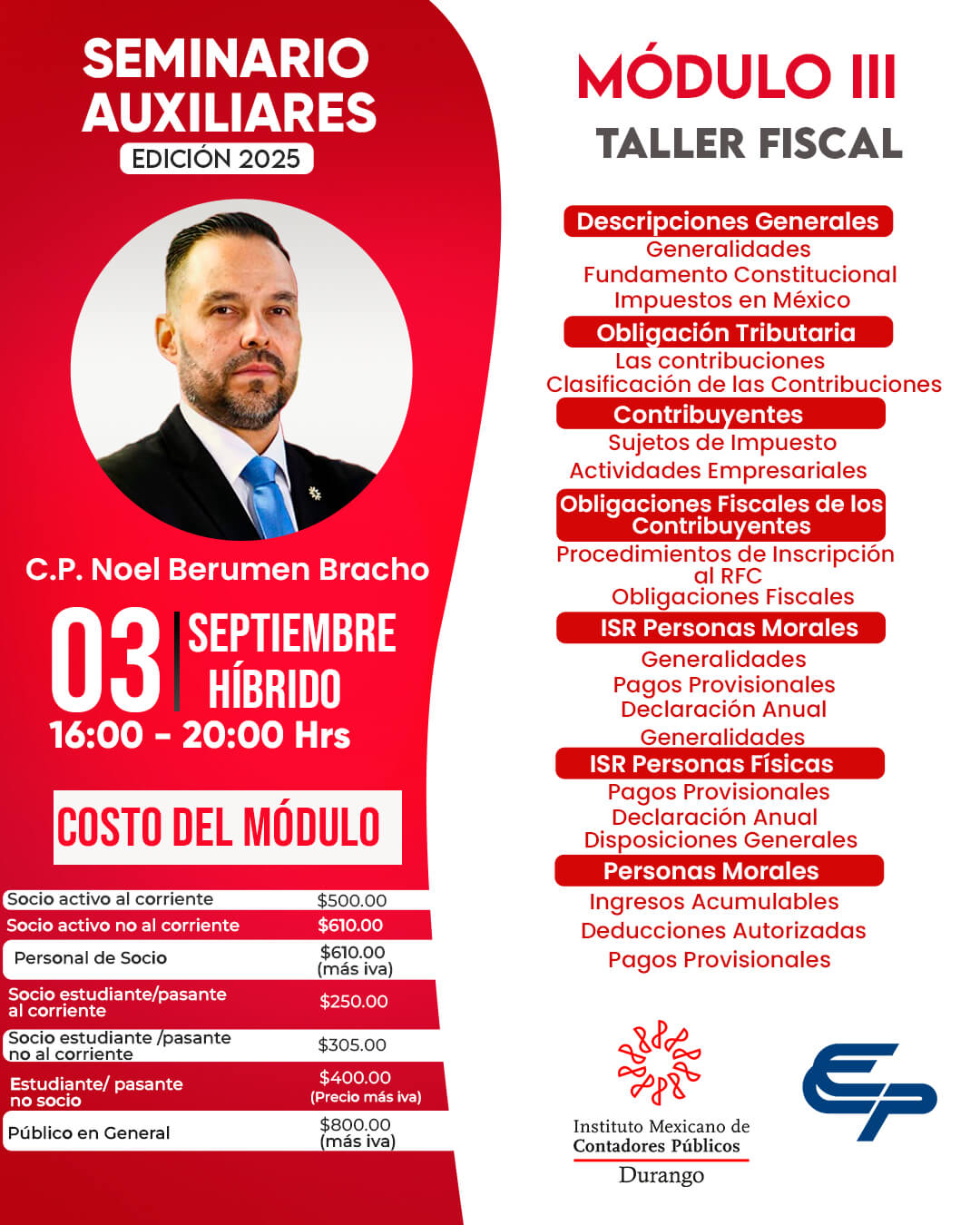 Así que lleva al siguiente nivel tus capacidades profesionales con 6 interesantes módulos del Seminario de Auxiliares Contables 2025, el cual se llevará a cabo el 20 de agosto al 24 de septiembre por el Colegio de Contadores Públicos de Durango A.C.