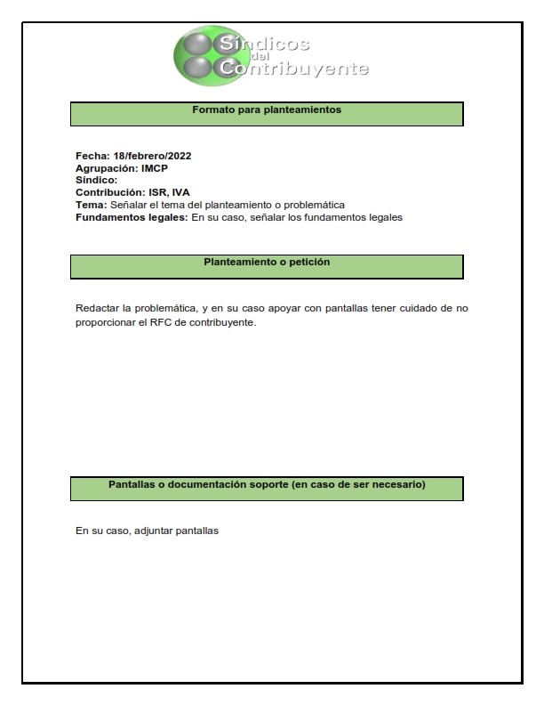 Formato planteamientos y peticiones de síndicos del contribuyente