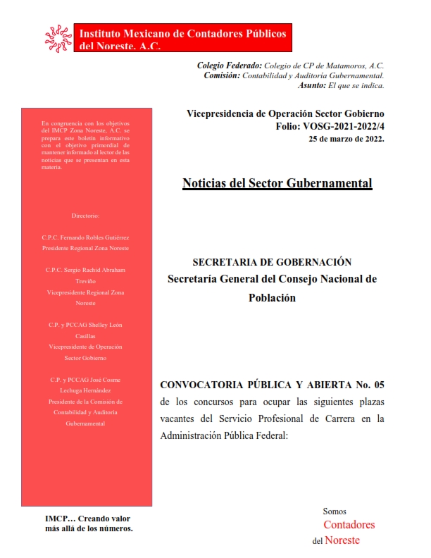 3° boletín de noticias edición marzo 2022: Convocatoria pública y abierta N° 05 para vacantes dentro de la Secretaria General del Consejo Nacional de Población: