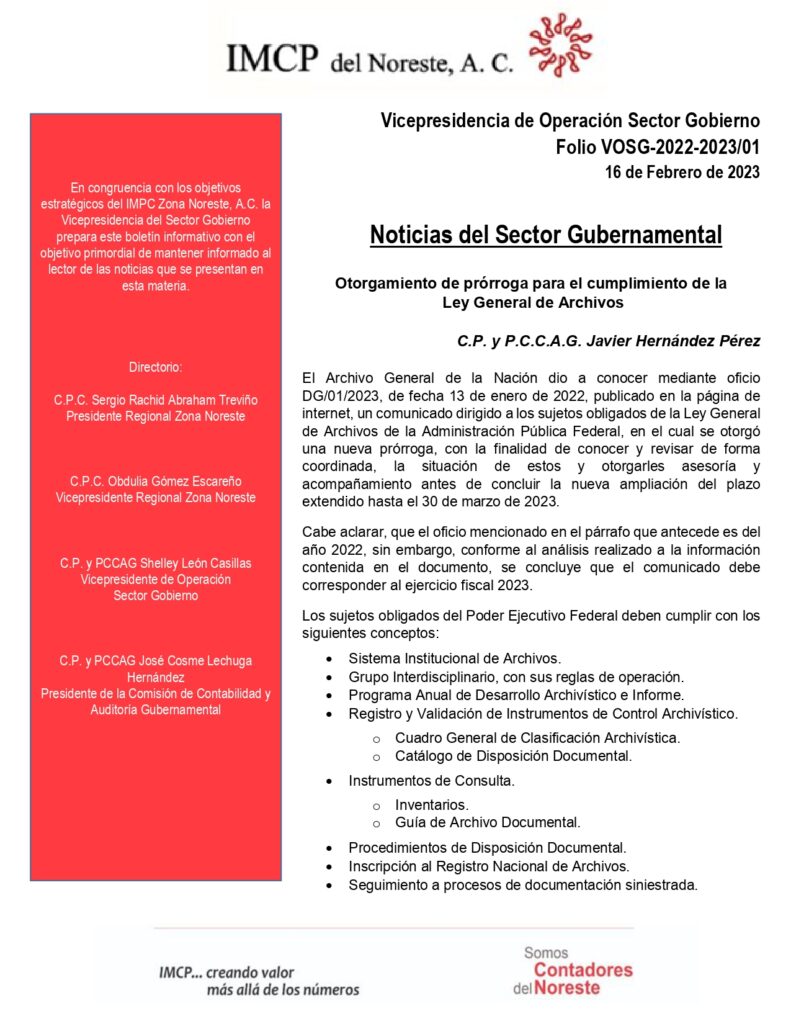 1° boletín de noticias edición febrero 2023: Otorgamiento de prórroga para cumplimiento de la Ley General de Archivos