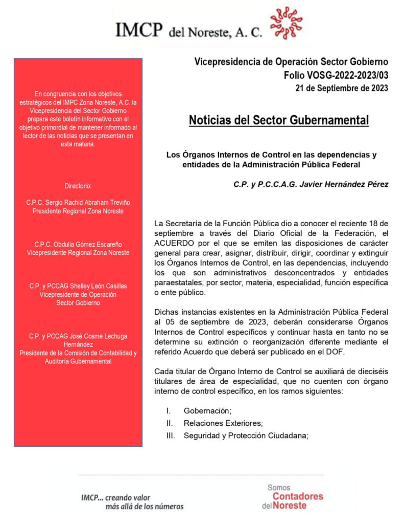 6° boletín de noticias edición septiembre 2023: Los Órganos Internos de Control en las dependencias y entidades de la Administración Pública Federal