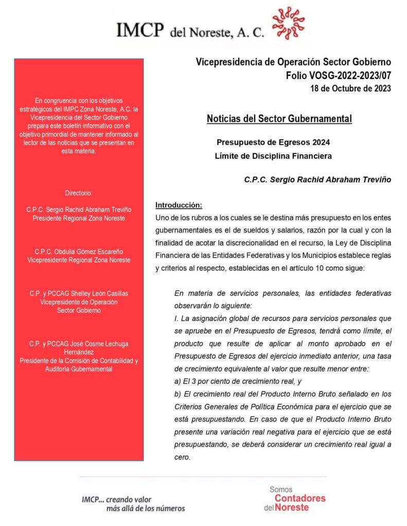 7° boletín de noticias edición octubre 2023: Presupuesto de Egresos 2024: Límite de Disciplina Financiera