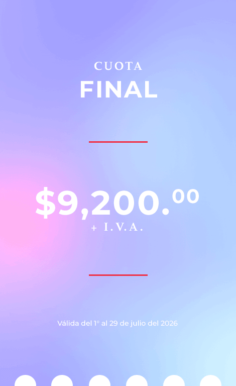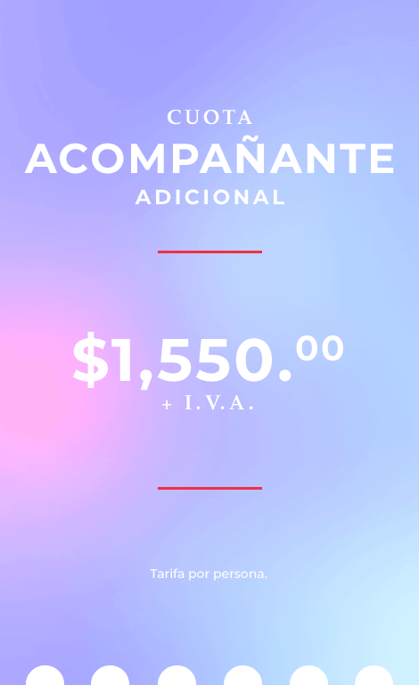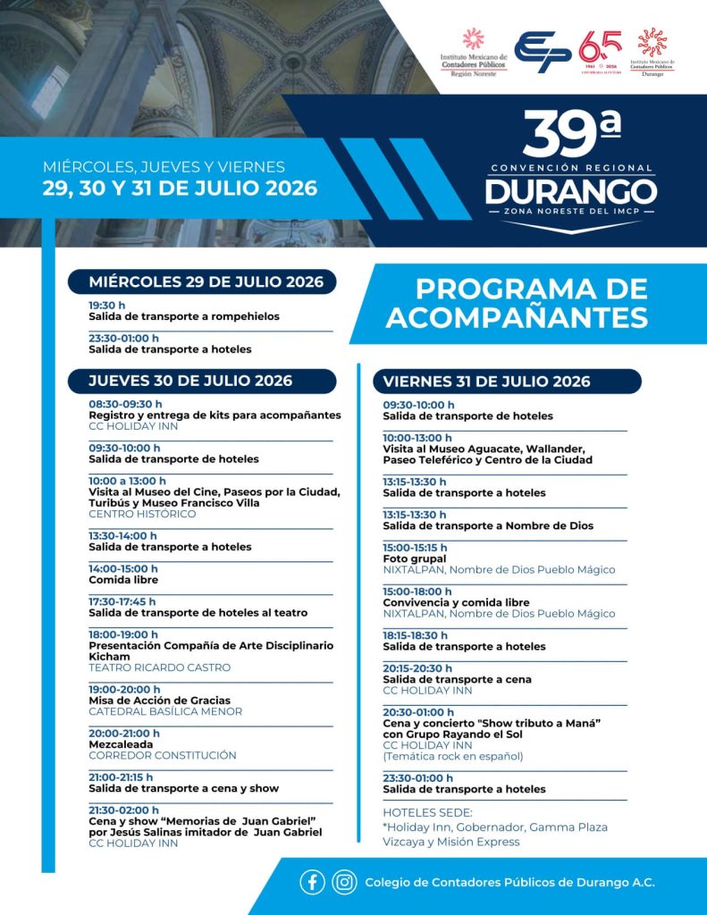 Incluye acceso a los eventos sociales y programa de acompañantes. Para más informes y registro de acompañantes, puedes contactarte al Colegio de Contadores Públicos de Durango al ccontadoresdgo@hotmail.com
